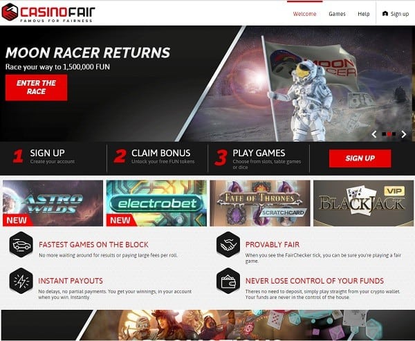 CasinoFair is Provably Fair meaning that each game you come across has fair play and results have not been tampered with. The results that come out are real without alterations or bias from other gamers, the casino or third parties. This online casino offers all members with instant full payouts that aren’t subject to delays, or partial payments. When you win, all your proceedings are immediately deposited into your account without any delays.